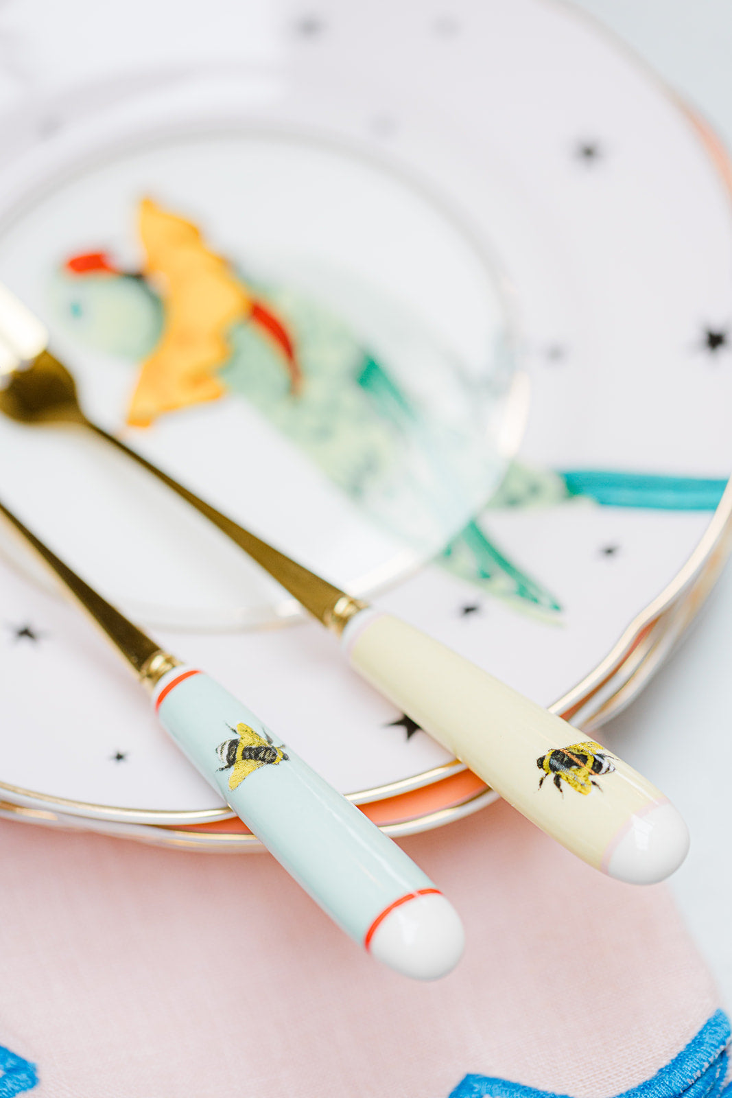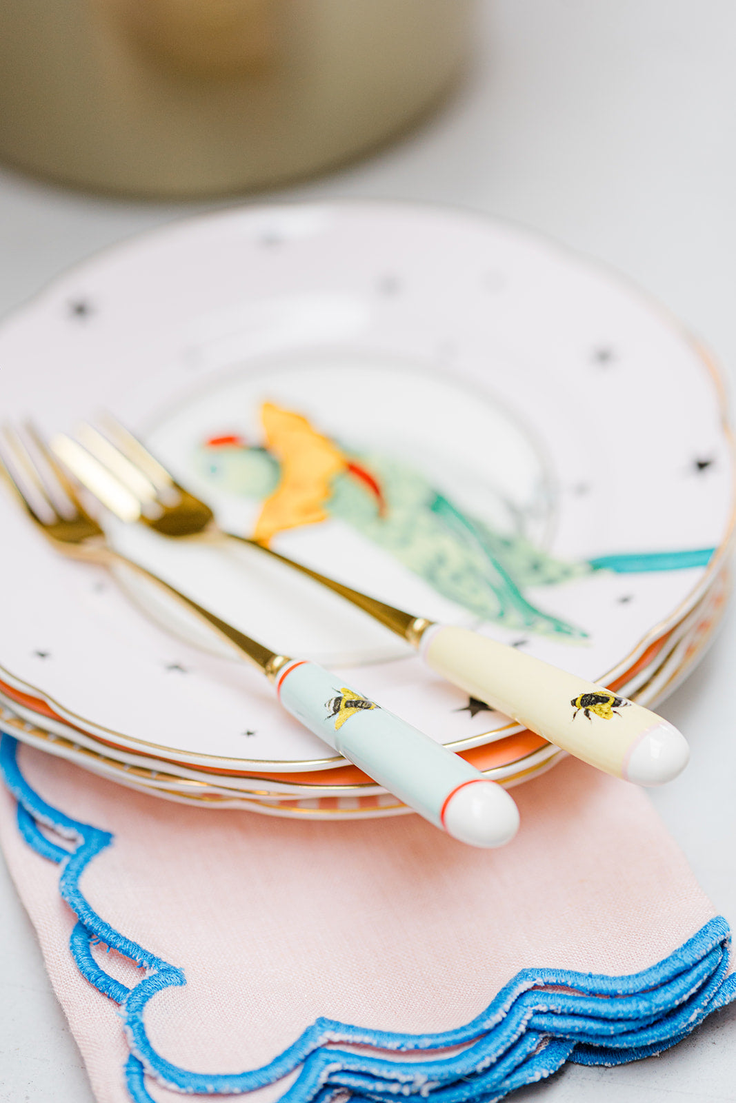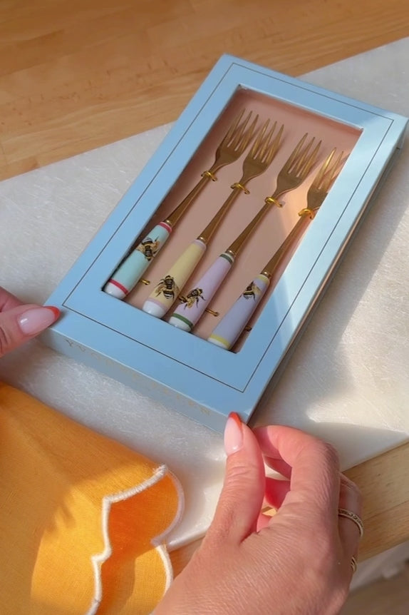Both fun and refined, this set of four cake forks have fine china handles and a polished gold-effect finish. Presented in a gorgeous box, this giftable set has my signature bee on them with mix-match pastel handles.