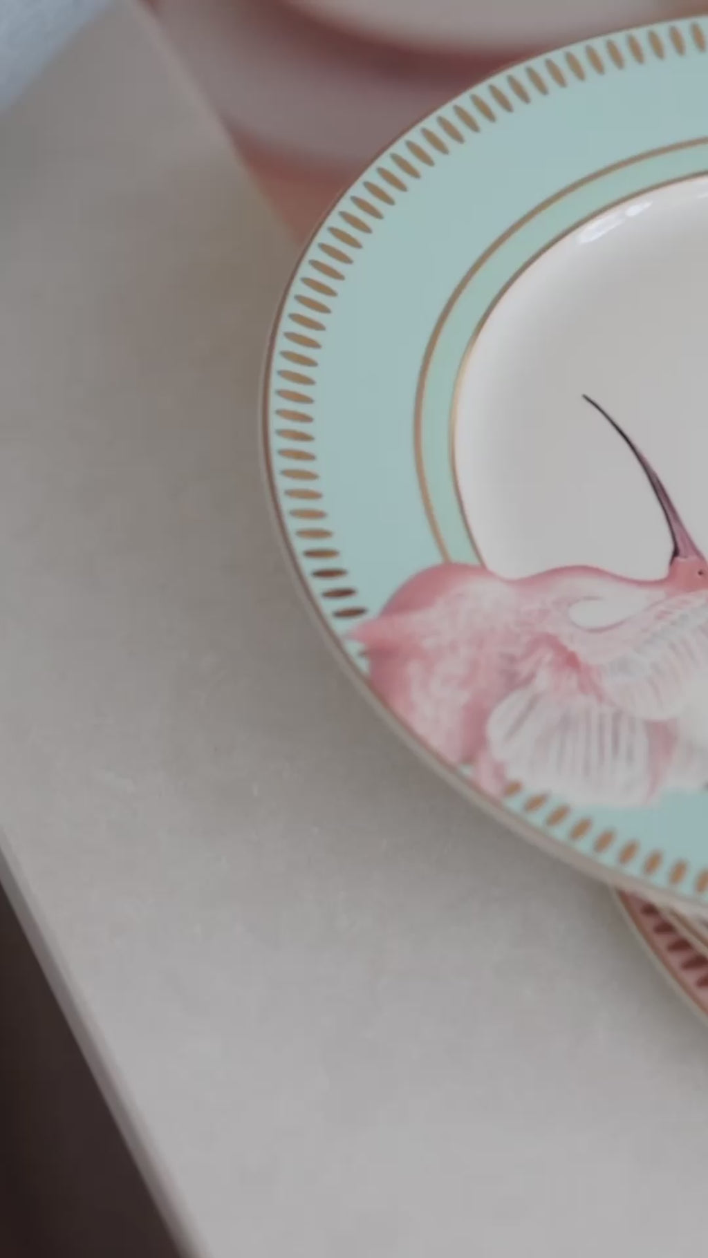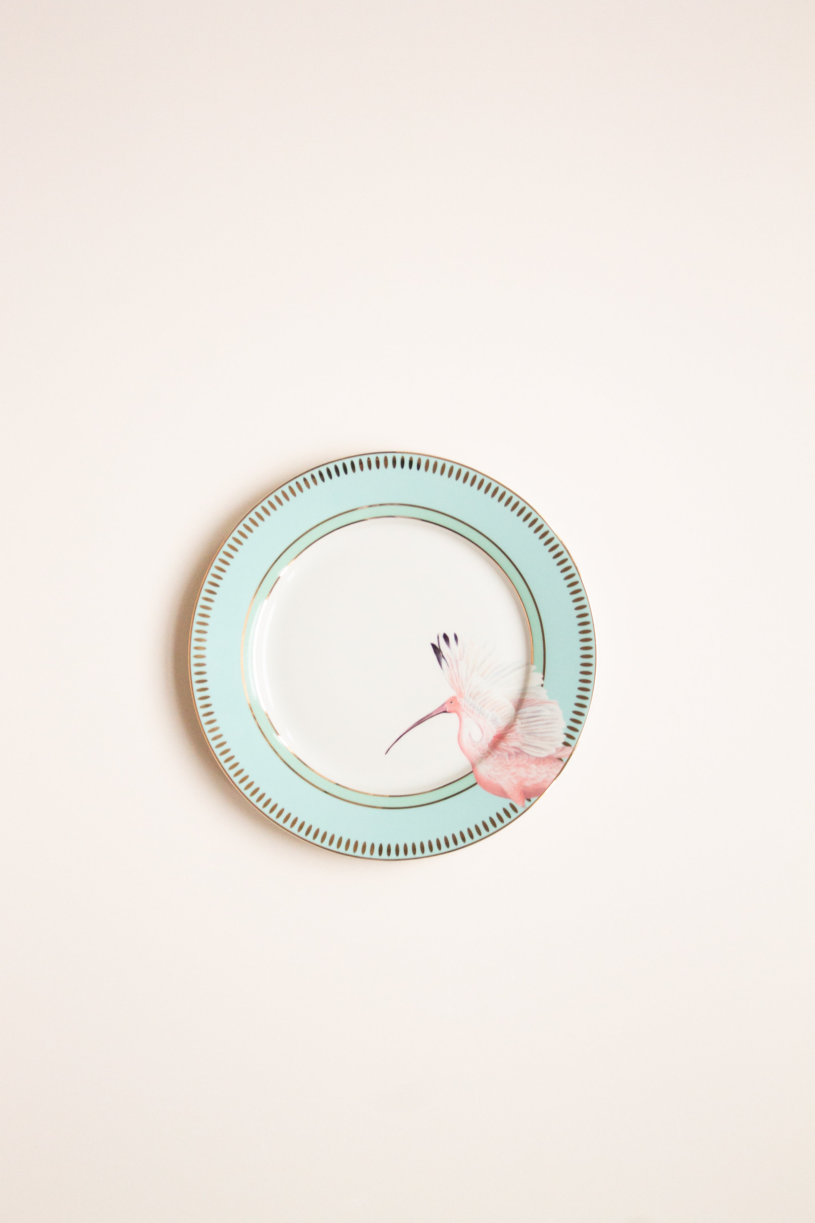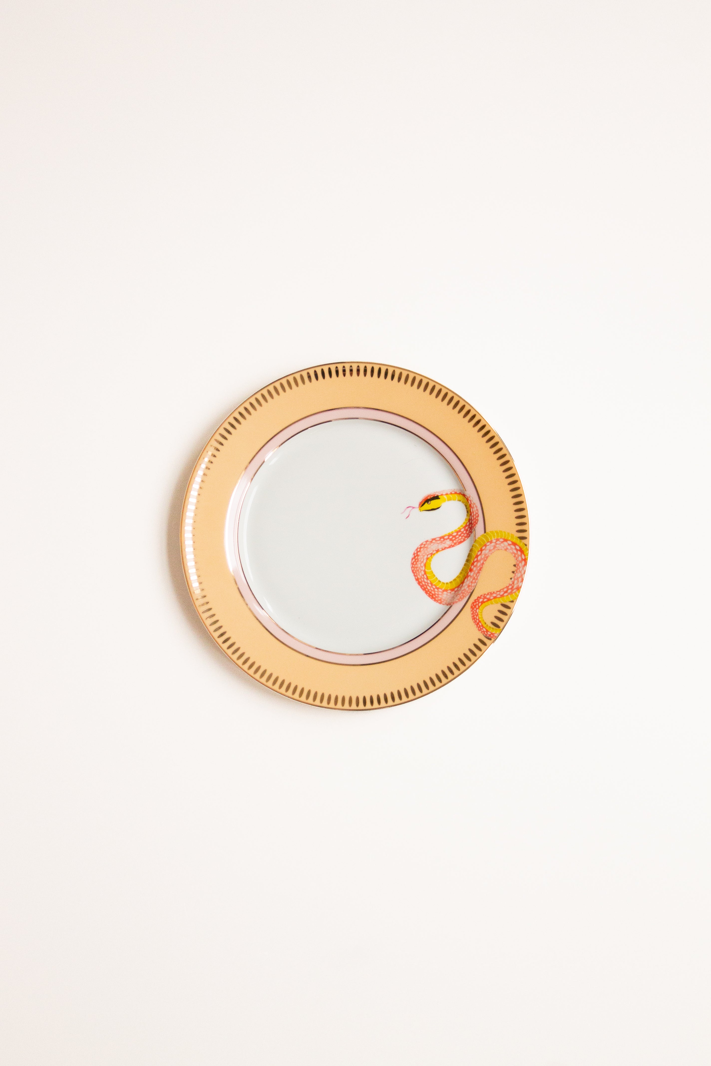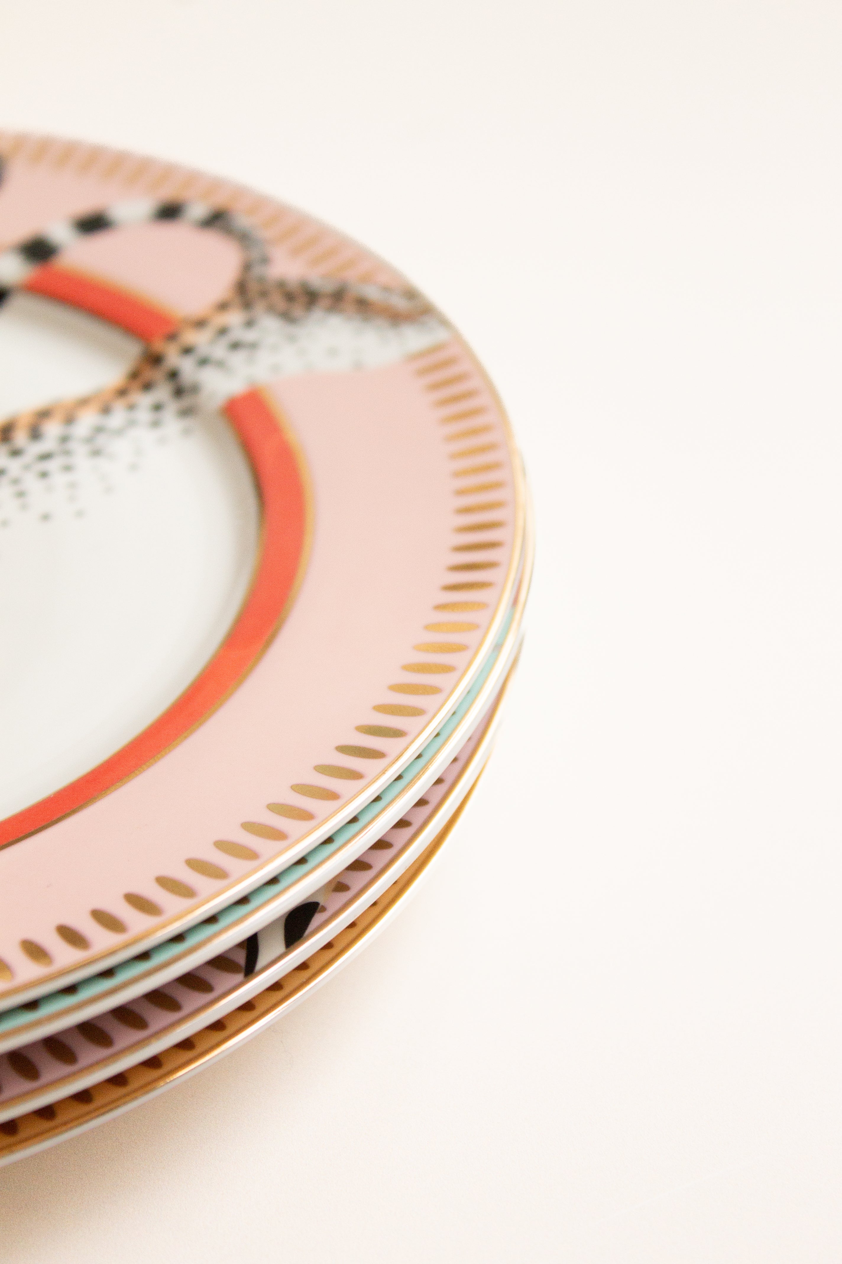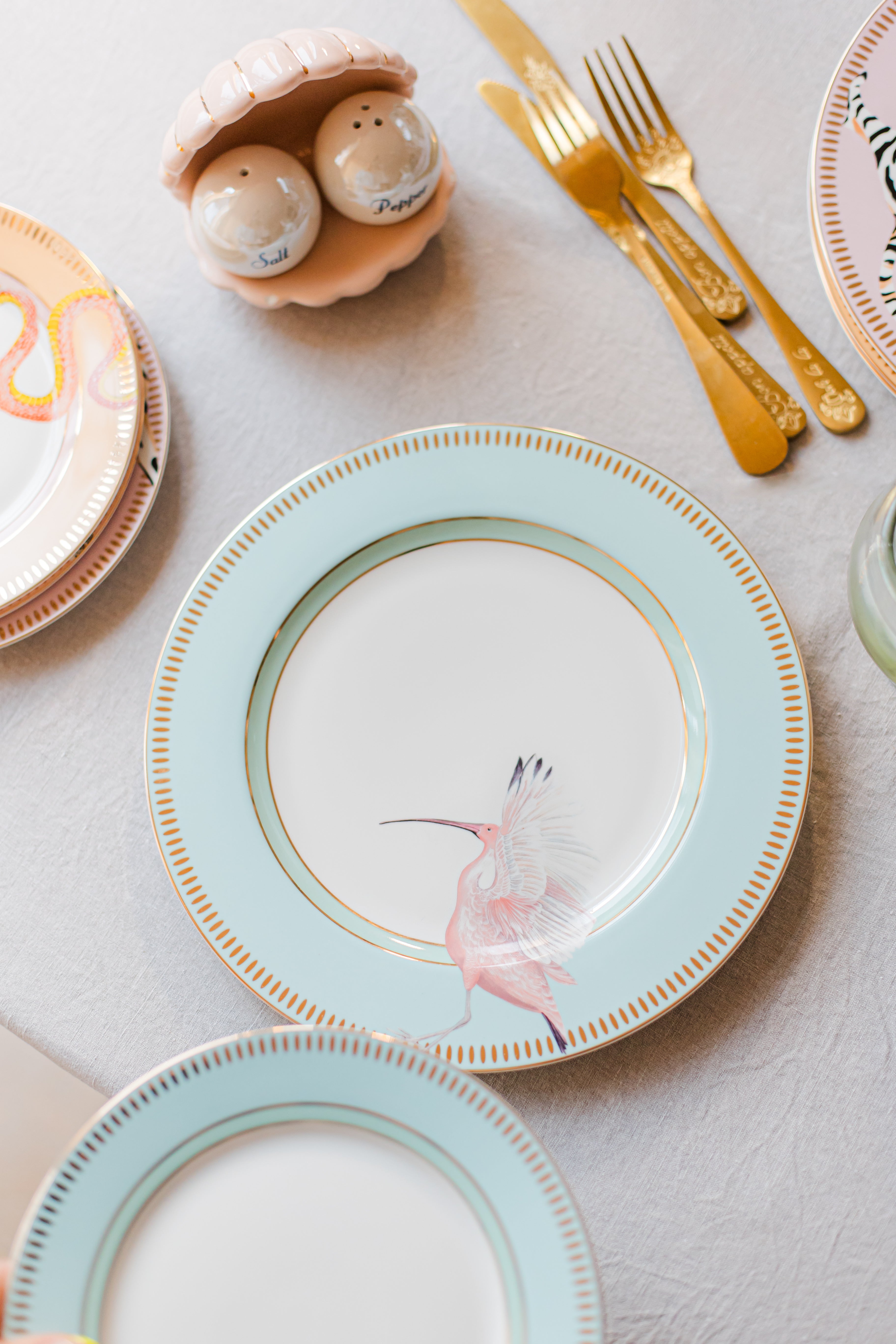 This quirky set is the embodiment of the Yvonne Ellen style: animal life juxtaposed in original, colourful compositions. The pastel side plates are adorned with four of my iconic animals decorated with cutesy accessories. These side plates match up perfectly with the dinner plates, along with the gold details this set is perfect for adding a funky feel to your next dinner party! Matching dinner plates, pasta bowls and cereal bowls available!