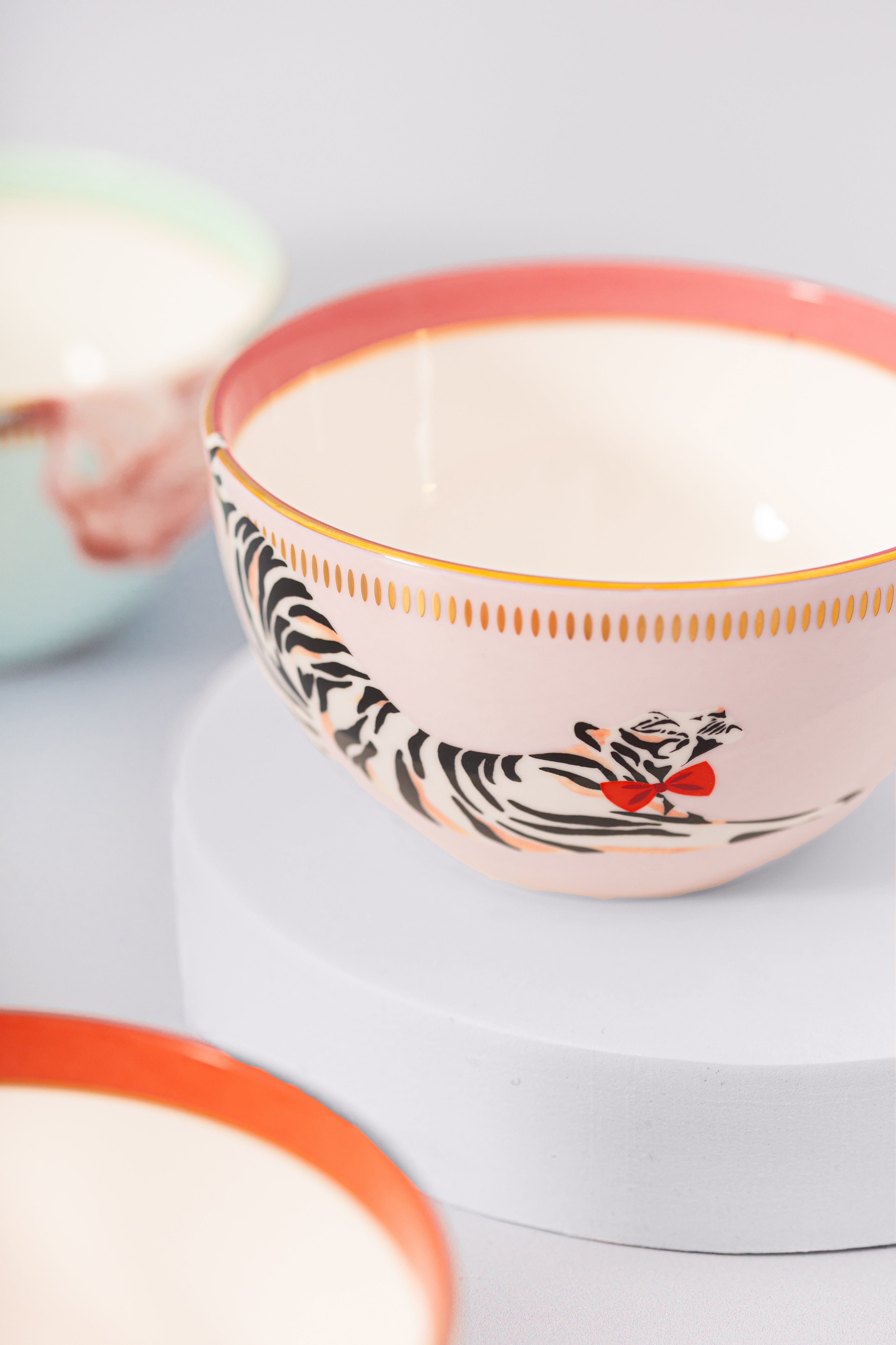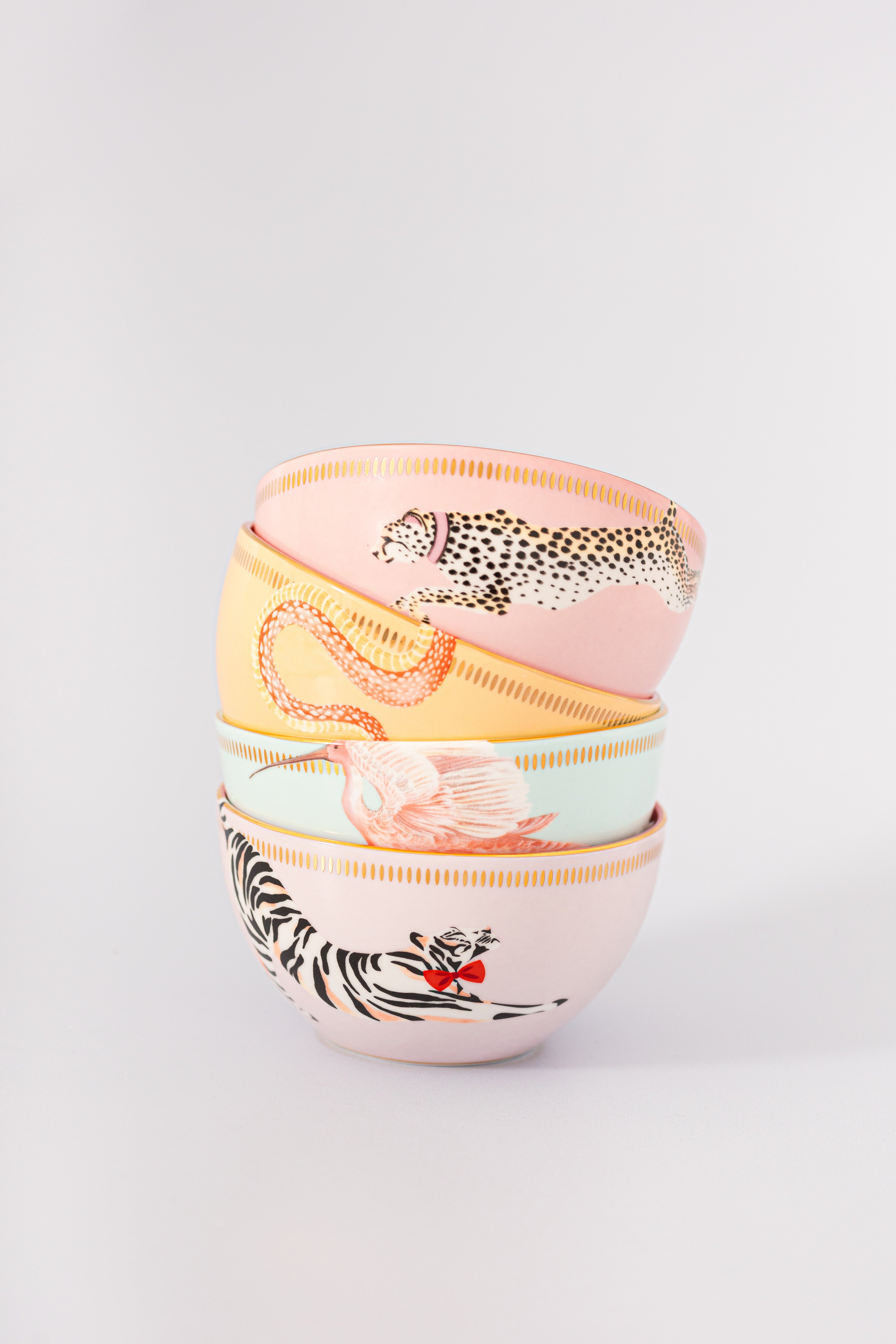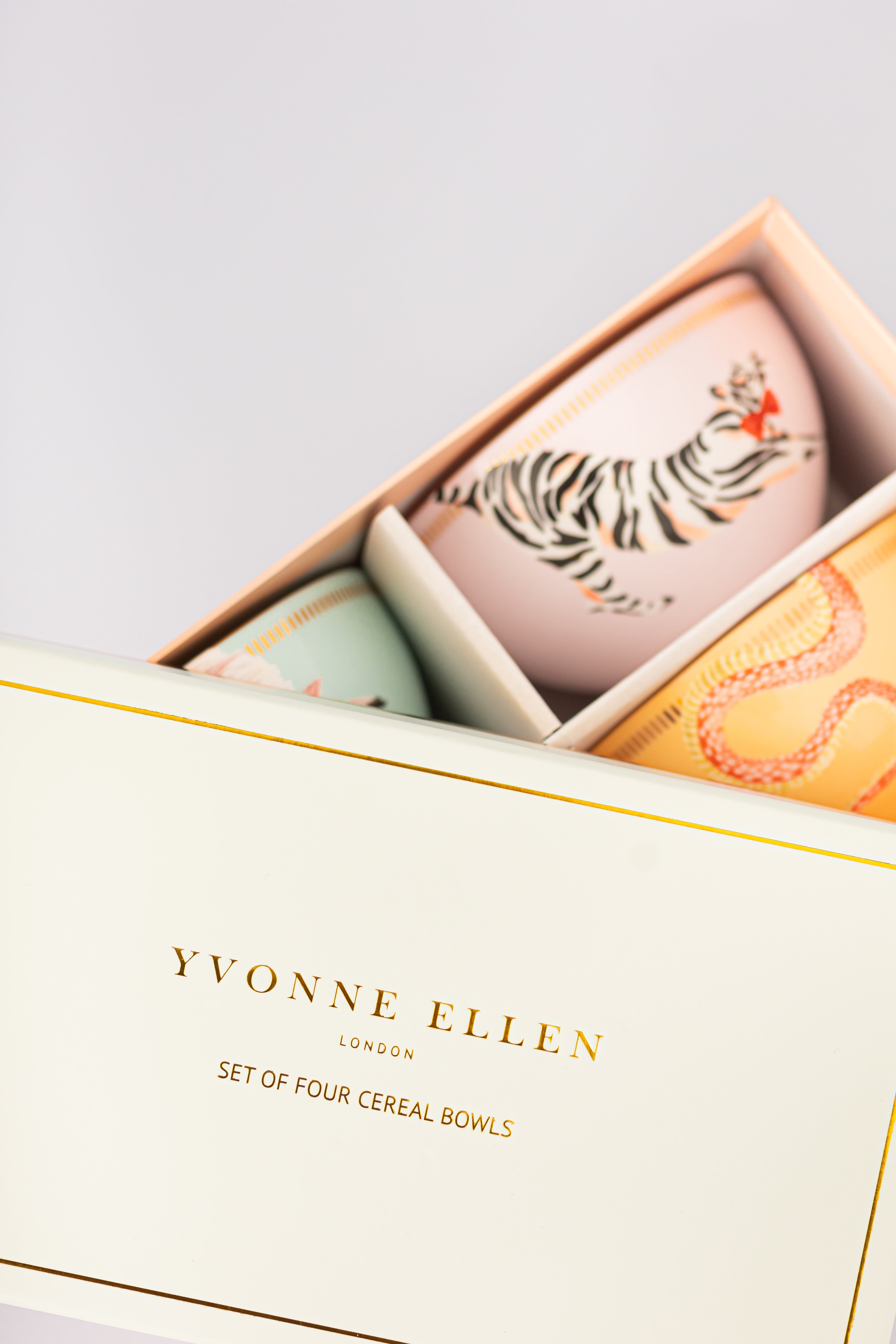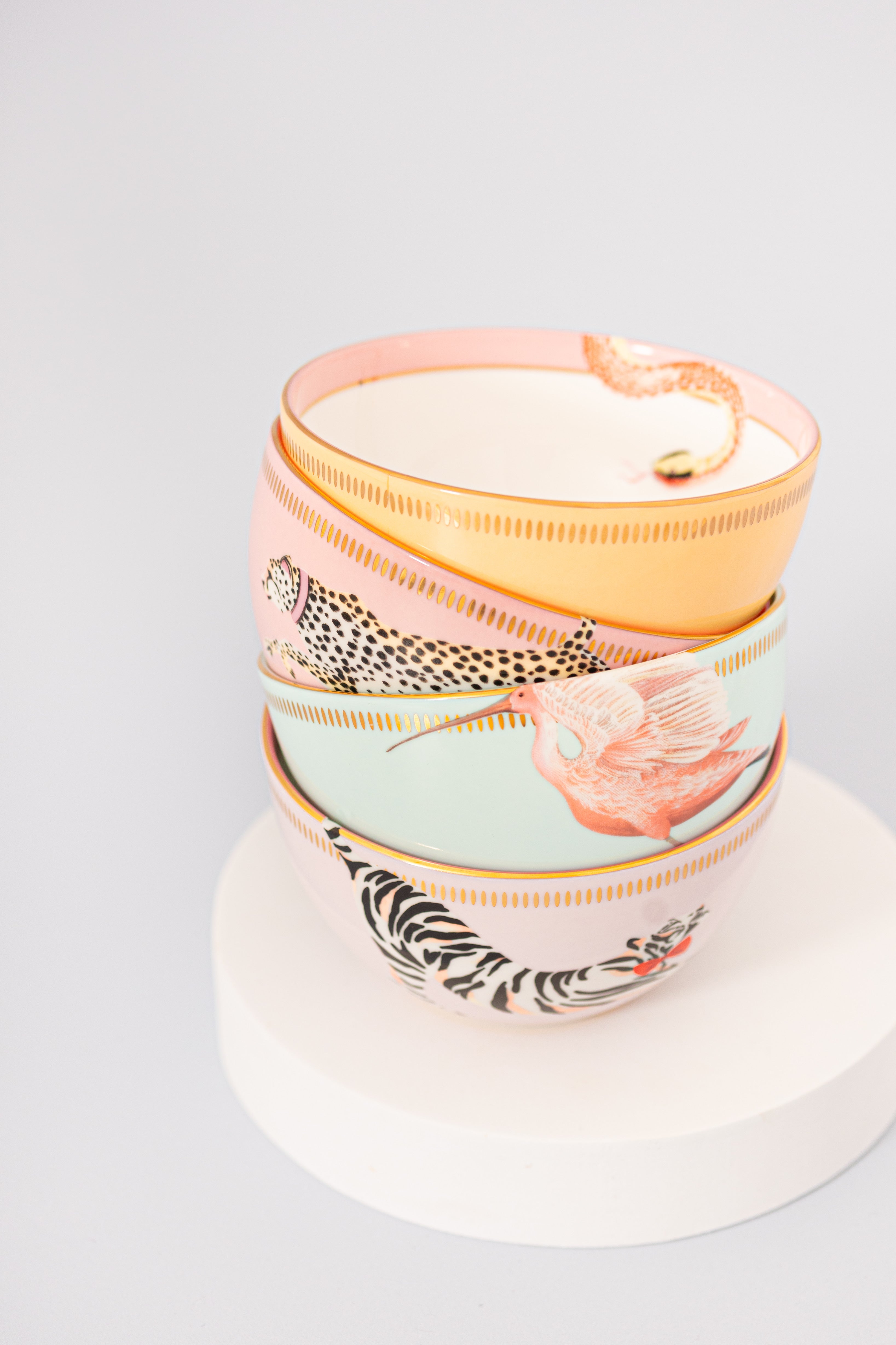 This quirky set is the embodiment of the Yvonne Ellen style: animal life juxtaposed in original, colourful compositions. The pastel cereal bowls are adorned with four of my iconic animals decorated with cutesy accessories. The gold details make this set perfect for adding a funky feel to your next dinner party! Matching Dinner Set Available.