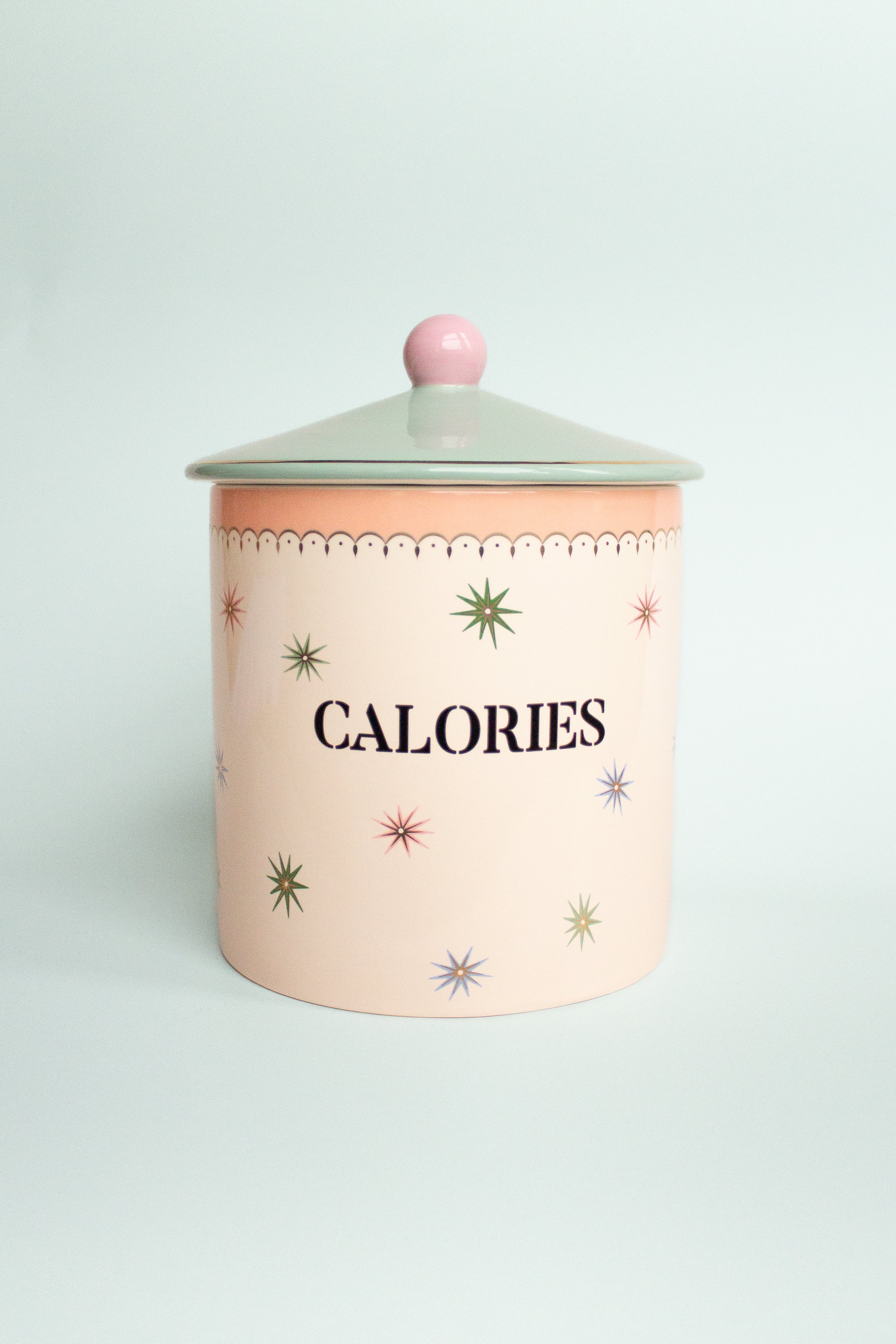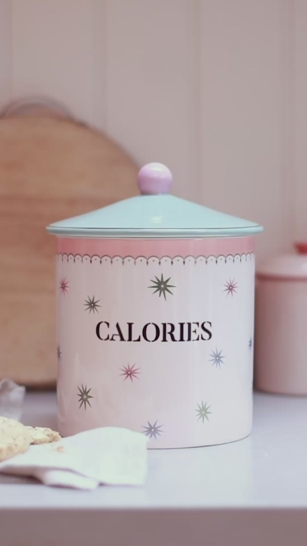 Add a little humour to your kitchen with the Calories Biscuit Jar. Featuring playful starburst details, soft pastel tones and a contrasting lid with a delicate gold rim, it is designed to keep your favourite treats tucked safely away in style.