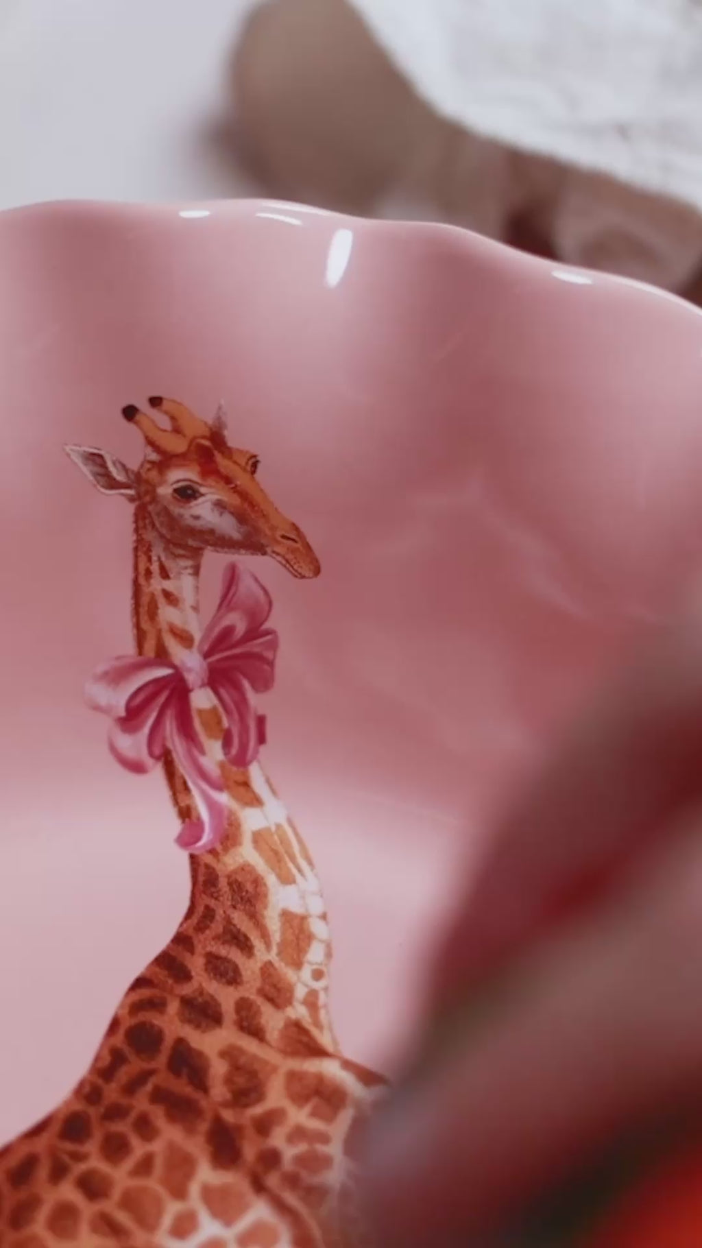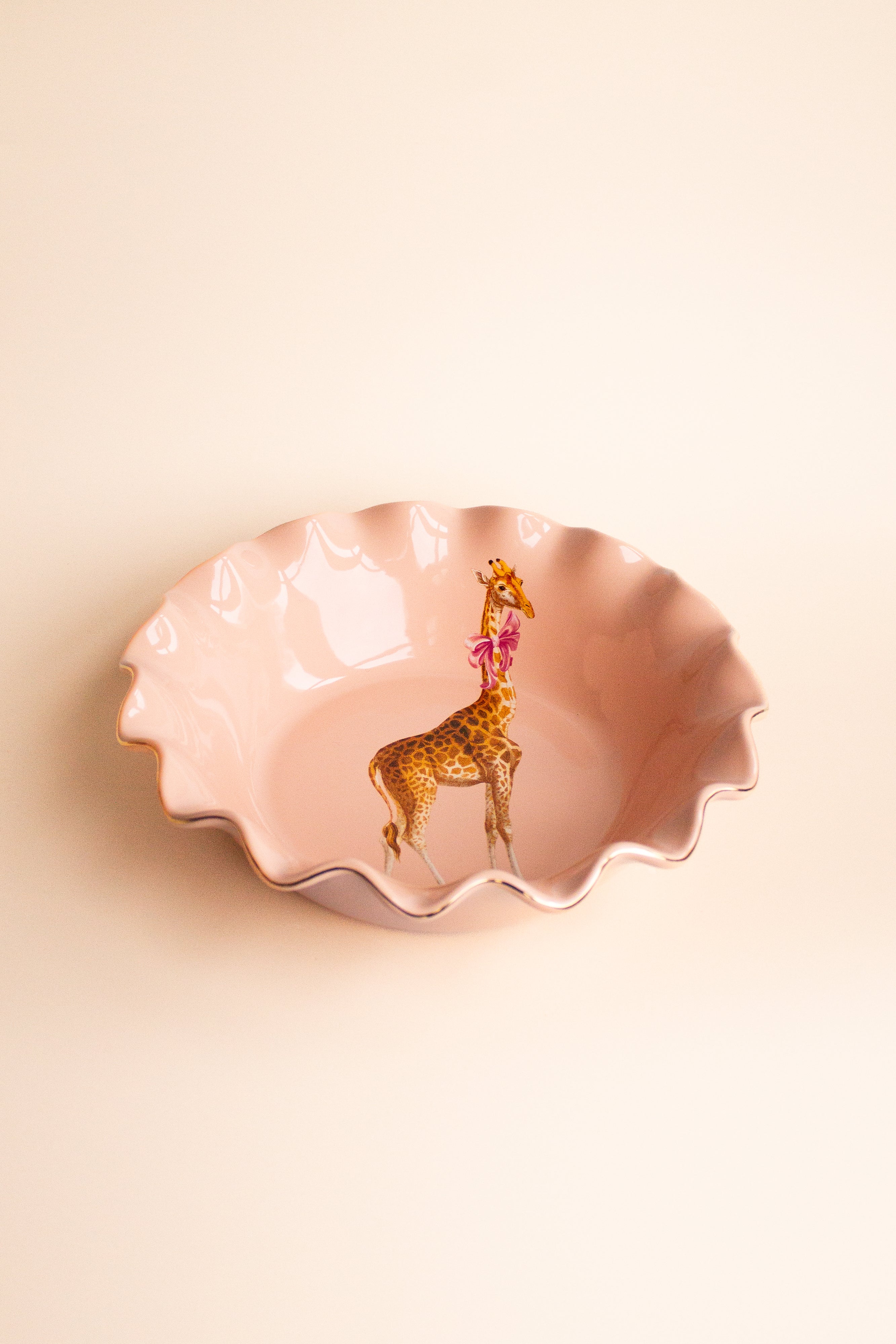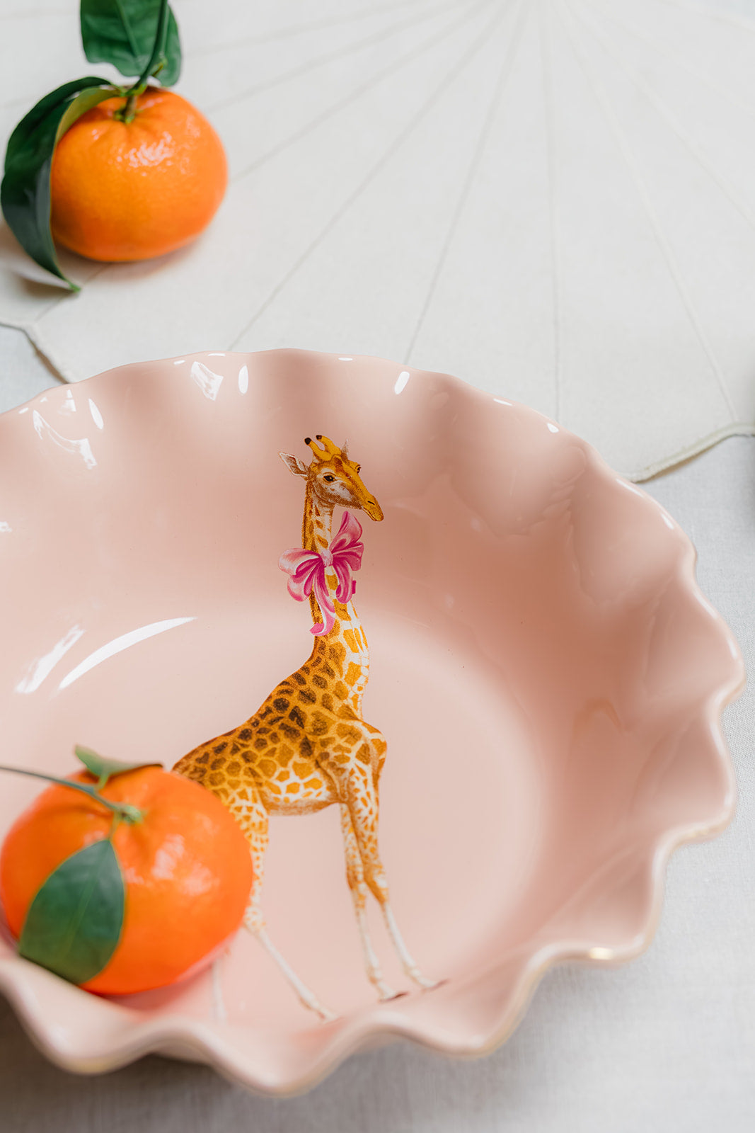 Add a playful statement to your table with the Giraffe Fruit Bowl. Featuring a charming giraffe illustration set against soft pastel tones and finished with a gently scalloped edge, it brings whimsical elegance to everyday dining.
