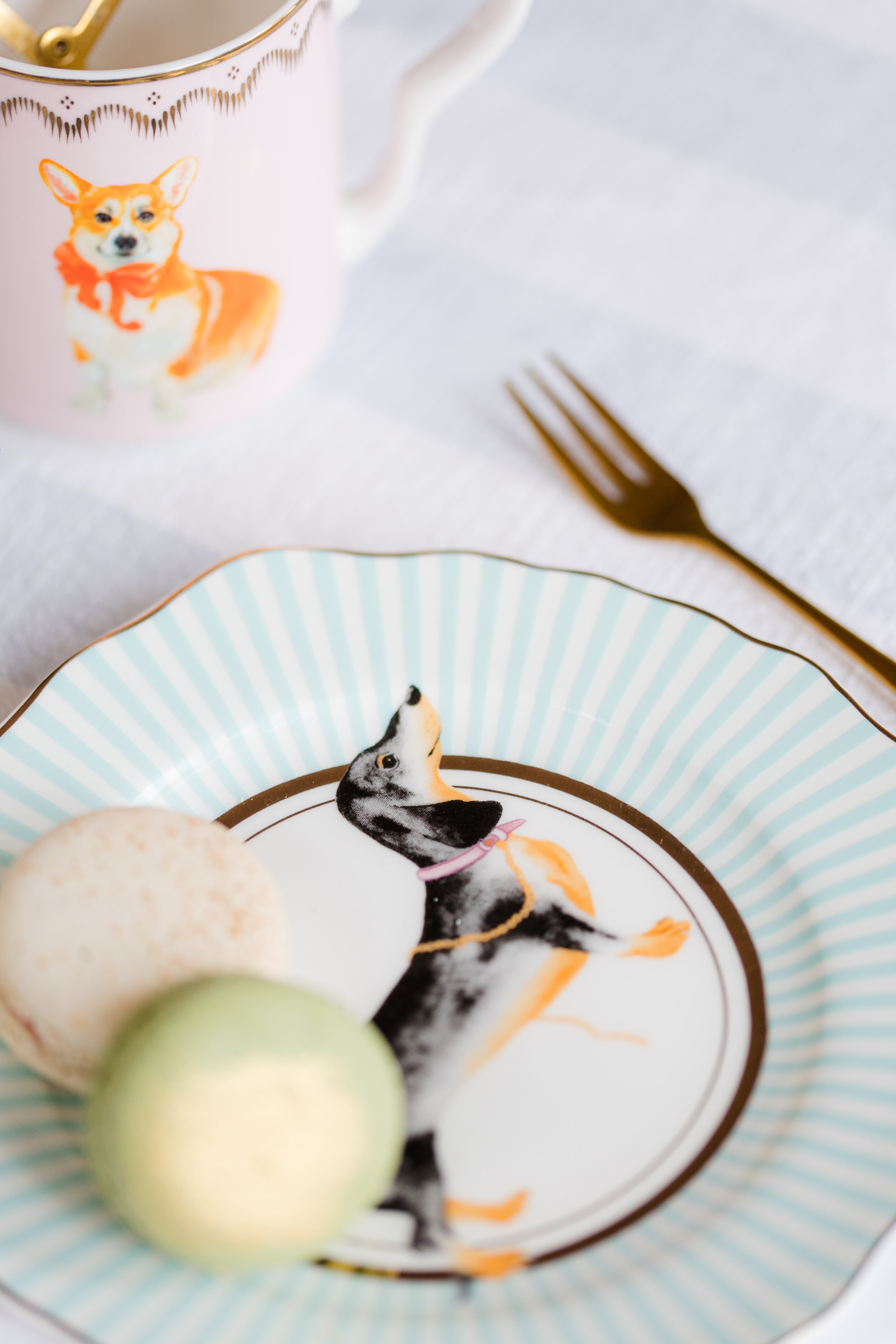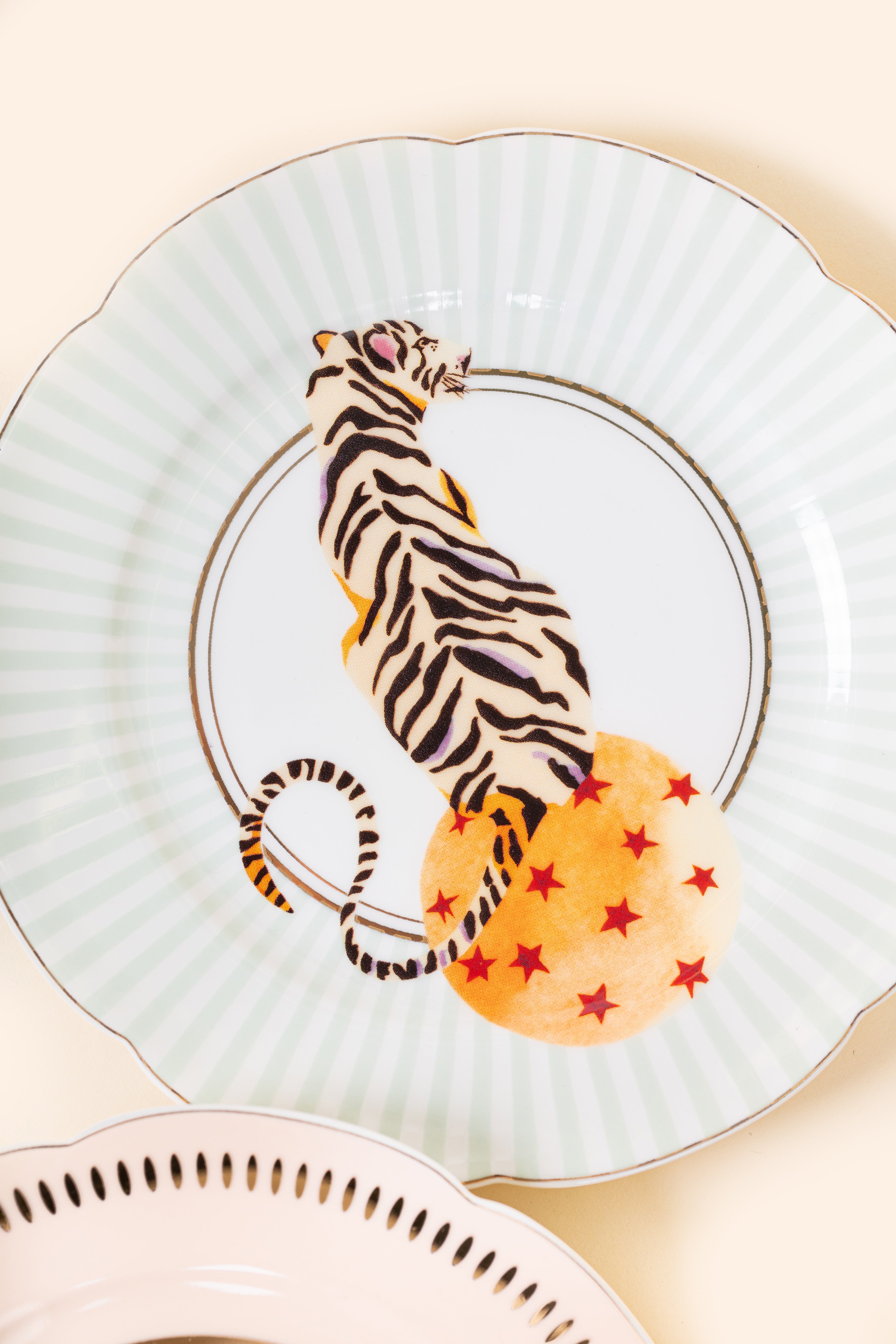 This tea plate set is the embodiment of the Yvonne Ellen style: animal life juxtaposed in original, colourful compositions. The pastel tea plates are adorned with four of my iconic animals (Tiger/Giraffe/Parrot/Doggie) decorated with cutesy accessories and patterned backgrounds. With fabulous gold detailing these are perfect for adding a funky feel to your next dinner party!