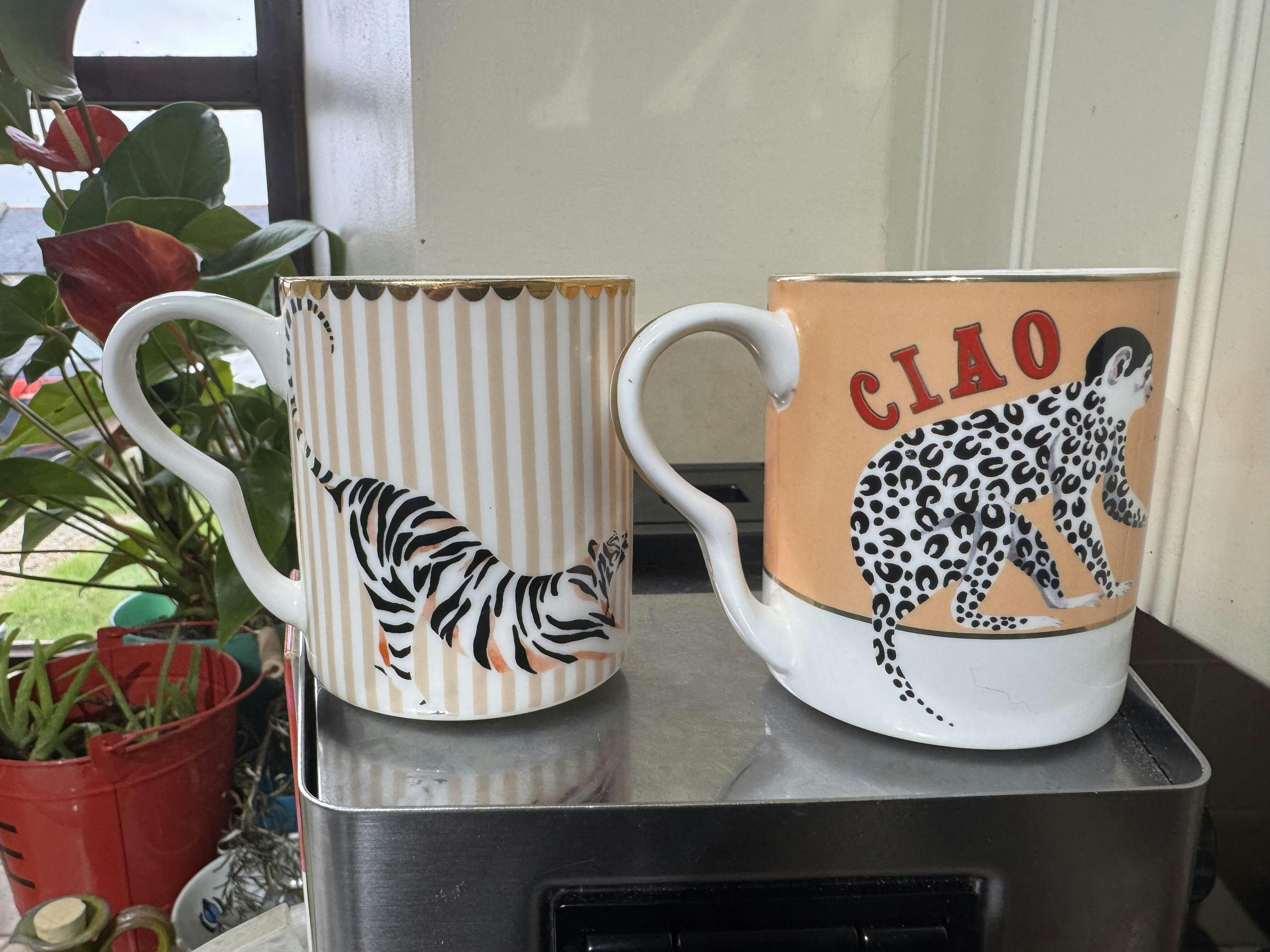A playful stretching tiger appears on this beautiful Tiger mug. Soft pink and white stripes and gold trimming together with a delightfully fashioned ridge handle make this a pleasure to look at and to use.
