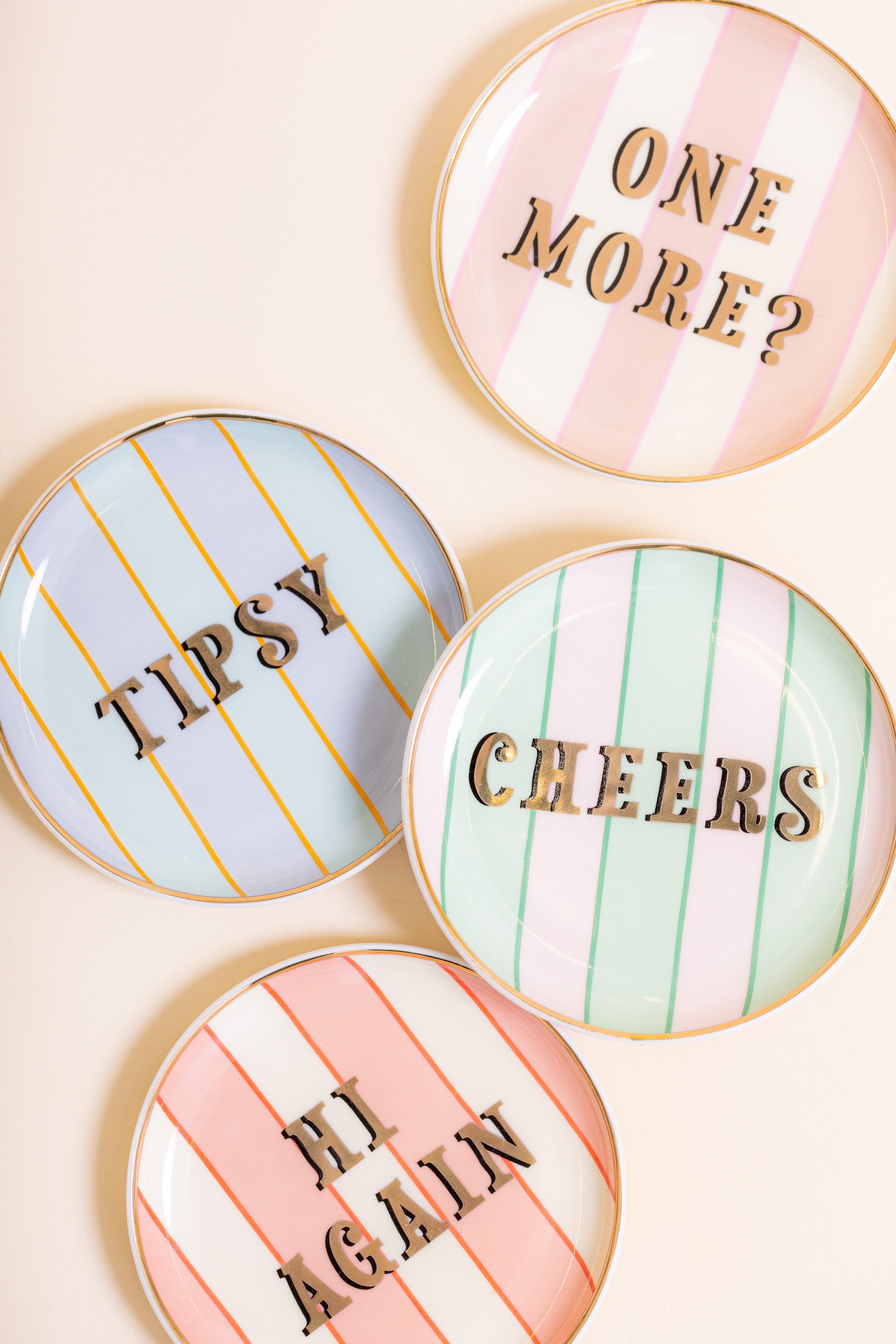 My iconic tipsy slogans are so cute on these coasters!! This set of four coasters will add charm and intrigue to your coffee table with vintage inspired pastel stripes and gold detailing.