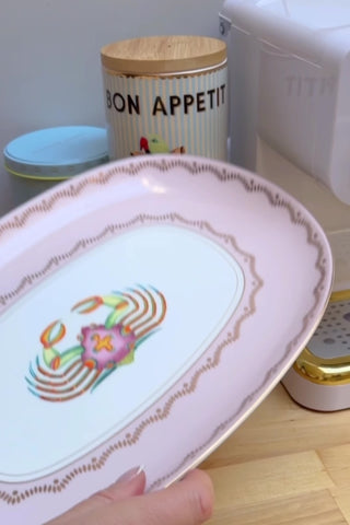 What a stunner! Perfect for under the sea lovers, this crab platter is sure to be a showstopper on your table. Our favourite Crab illustration adorns the middle of the plate, wrapped with luxurious gold detailing and pastel pink edges.