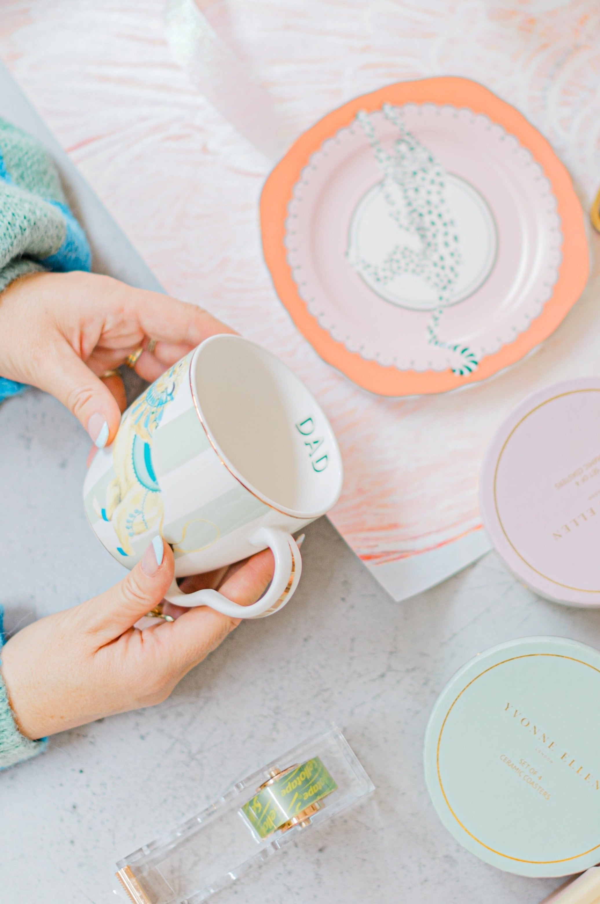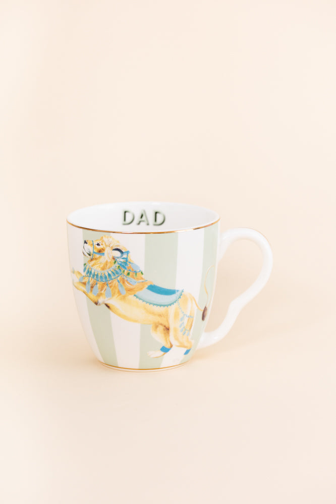 This mug is an ideal gift for birthday's, Christmas or fathers day, a great way to celebrate your lovely dad. This large mug has green stripes and a gold gilded rim for extra elegance! Our lively lion decorated in blue finery adorns the sides of the mug and there's a hidden DAD slogan inside!