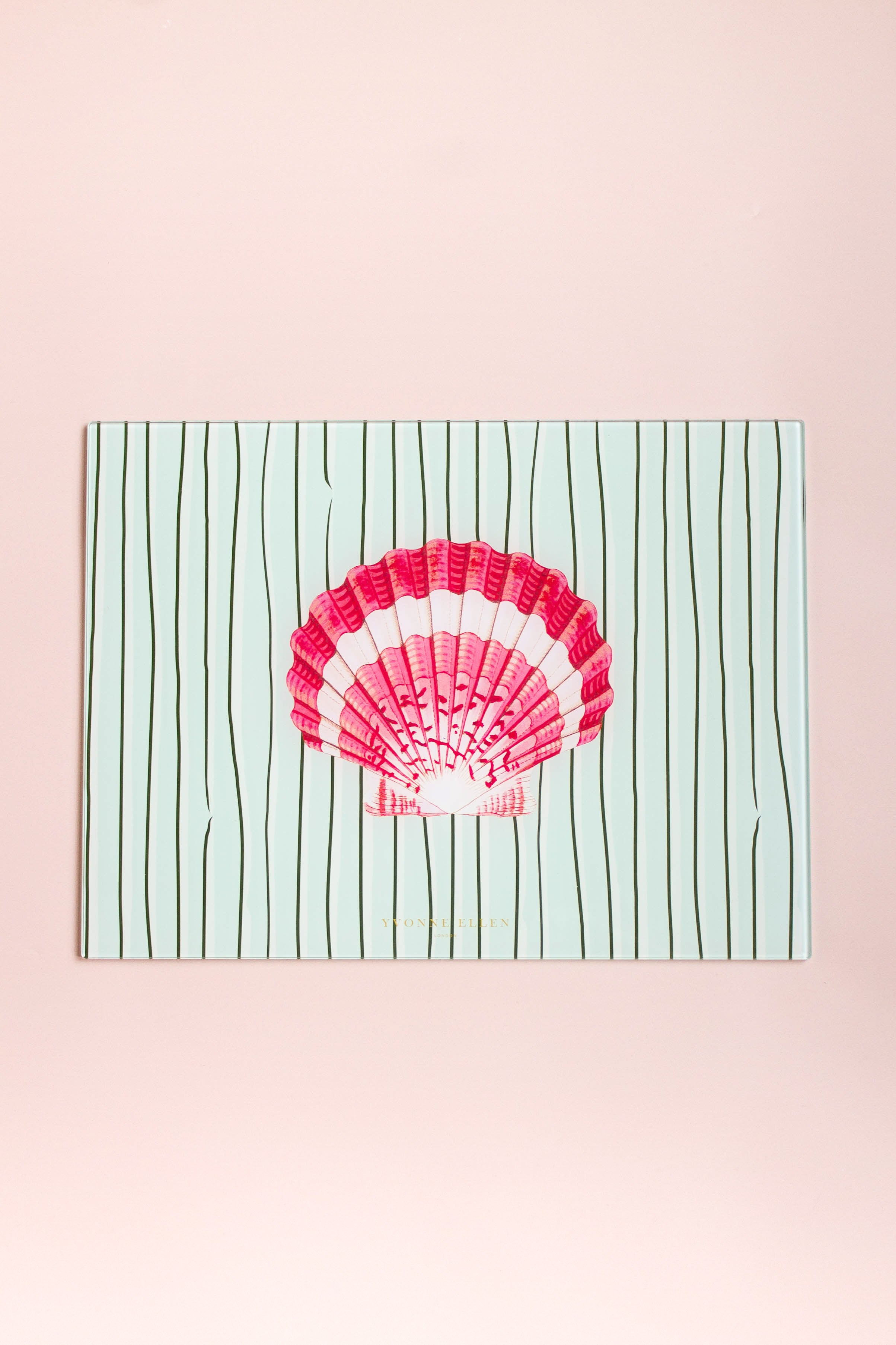 My Seashell illustration is finally on a gorgeous glass worktop saver, with a stylish green striped background and gold Yvonne Ellen logo. It's perfect for adding a coastal charm as an essential addition to any kitchen.